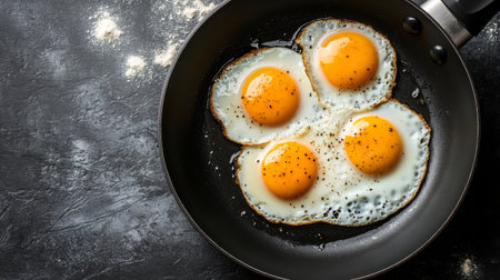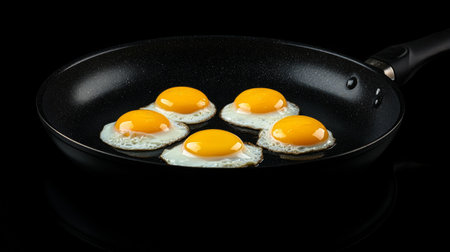 A non-stick frying pan with eggs frying perfectly in the center, with the golden yolks standing out against the black pan surface.