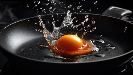 A fresh egg cracks into a hot frying pan, creating a dynamic splash of water and oil. The close-up captures the beauty of cooking in action, emphasizing freshness and culinary skill.