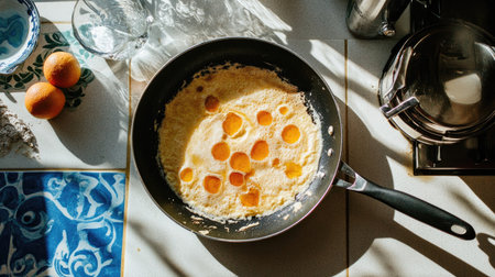 A vibrant scene capturing the process of cooking eggs in a frying pan, illuminated by natural light. Ideal for culinary and lifestyle themes.