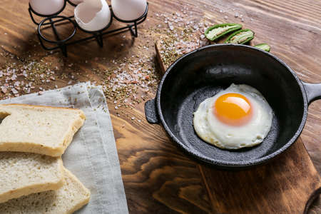 Frying pan with tasty egg on table