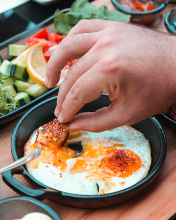fried eggs in a frying pan, with cheese and chicken, stylish serving of dishes in a cafe and restaurant