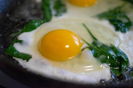 fried eggs in a frying pan with green spinach
