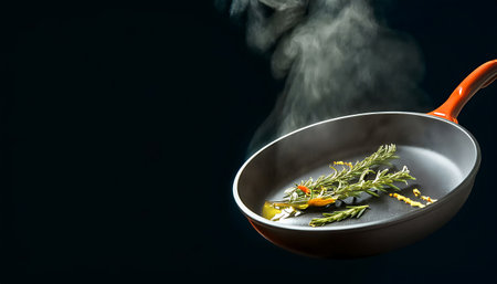 A close-up image of fresh herbs sizzling in a non-stick pan with steam rising, set against a dark background, highlighting the cooking process and culinary artistry.