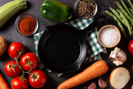 Empty rustic frying pan and various spices. dark background. Cooking concept.