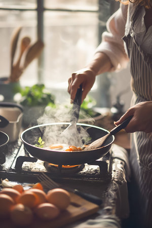 An image of a home cook adding ingredients to a sizzling pan, with a focus on the cooking process and kitchen ambiance