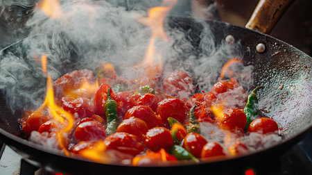 An action-packed close-up of a wok pan frying fresh ingredients, including red tomatoes and hot peppers, surrounded by swirling smoke and flames, creating an enticing culinary atmosphere.