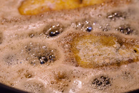 A vibrant scene of crispy fried food sizzling in a pan, showcasing the cooking process. Perfect for capturing the essence of culinary delights and kitchen atmosphere.