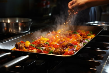 A vibrant stir-fry cooking in a hot pan, showcasing fresh ingredients and aromatic spices. The sizzling sounds and steam create an enticing culinary scene.