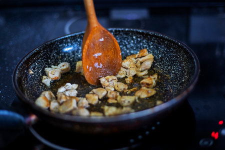Process of cooking sliced champignon mushrooms in black frying pan with oil on electric stove. Professional cooking, catering, cookery, gastronomy and food concept