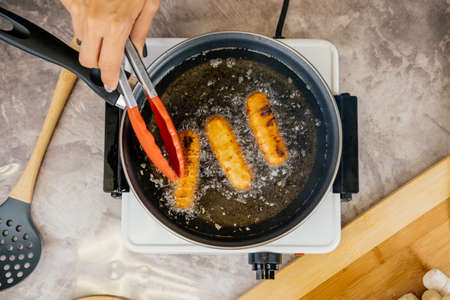 Latin american cook preparing and frying venezuelan tequeños, latin appetizer