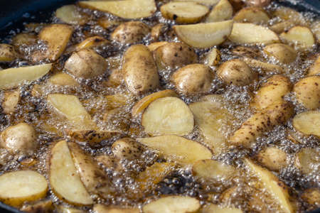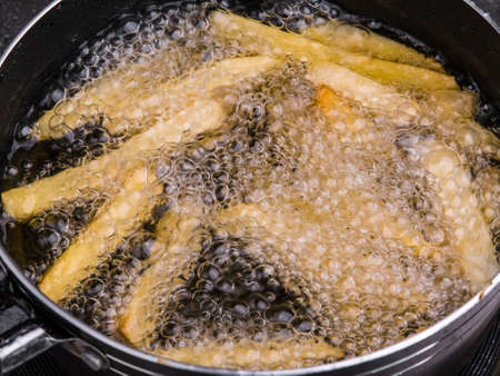 Close up of Frying french fries in the fryer in hot oil on the electric stove in the kitchen. Making homemade french fries.