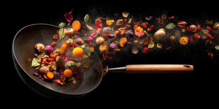 A stunning visual of vibrant ingredients in a wok, captured in motion, showcasing the beauty of cooking. The colorful blend symbolizes freshness and creativity in culinary arts.