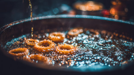 This captivating image showcases golden brown dough rings frying in hot oil, surrounded by bubbles and steam, creating a mouthwatering and inviting scene.