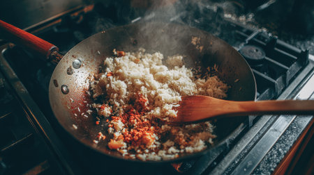 A cozy kitchen scene depicting rice being cooked with spices in a pan, showcasing steam rising and a wooden spoon stirring, perfect for culinary inspiration.