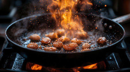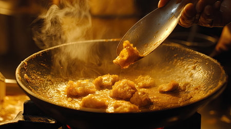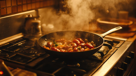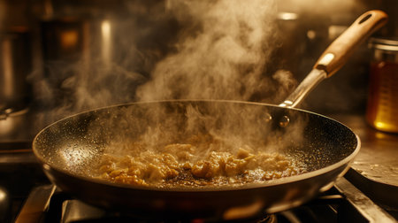 A close-up of a frying pan with sizzling ingredients being sauted, with oil and spices shimmering, placed on a stovetop with soft, ambient lighting
