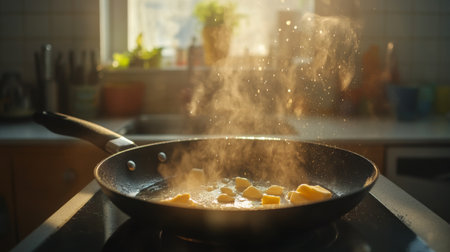 A vibrant scene of scrambled eggs cooking in a frying pan on a stovetop. Soft steam rises, creating an inviting atmosphere in a modern kitchen. Perfect for food lovers.