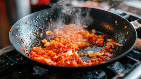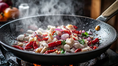An inviting shot of chilies, garlic, and onions sizzling in a hot pan, with steam rising and rich colors blending together, creating an appetizing atmosphere