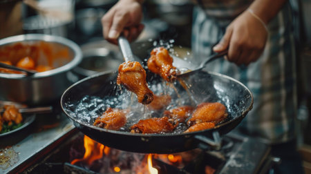 A vibrant image featuring crispy fried chicken cooking in hot oil, creating splashes and steam, emphasizing the art of cooking in a lively kitchen atmosphere.