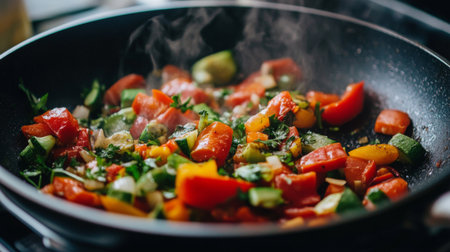 A lively scene of assorted vegetables sizzling in a frying pan, capturing the essence of healthy cooking with vibrant colors and steam. Perfect for culinary inspiration.