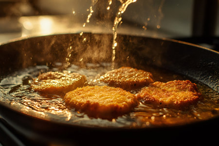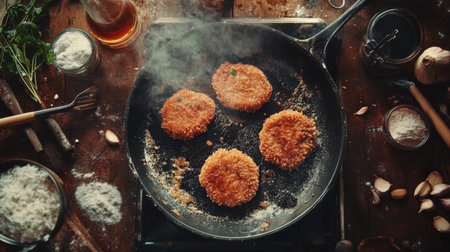 Golden crispy patties sizzle in a frying pan, surrounded by fresh ingredients. A warm, inviting kitchen scene perfect for cooking enthusiasts and food lovers.