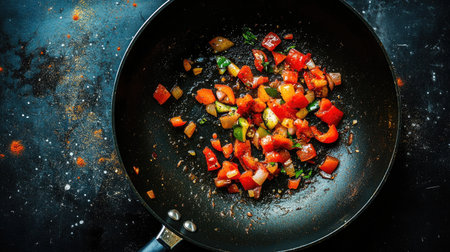 A vibrant shot of a frying pan with sizzling vegetables and spices, captured from above to highlight the colorful and appetizing dish being prepared.