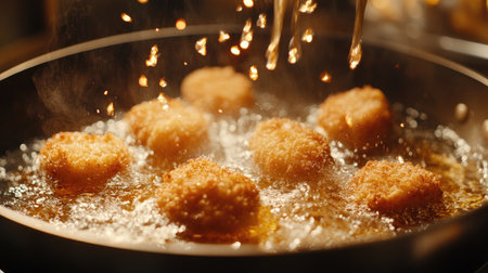 A dynamic kitchen scene capturing the process of frying golden brown food balls in hot oil, with steam rising, creating a mouthwatering atmosphere.