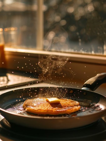 A sizzling frying pan with food in motion, surrounded by kitchen utensils and ingredients, evoking the energy of cooking