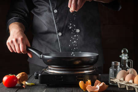 The chef adds salt while cooking eggs in a pan. Work environment on vintage kitchen table