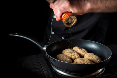The chef adds salt to a hot pan with meat burger cutlets. Free space for hotel menu or recipe on black background.