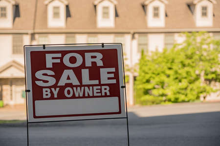 Blank for sale by owner sign in front of a row of town houses or homes in the USA
