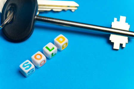 paper houses, paper keys and wooden tags with the words sold out. the concept of home sales