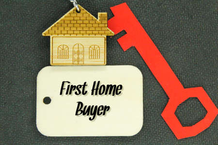 paper keys, wooden houses and wooden tags with the words first home buyer