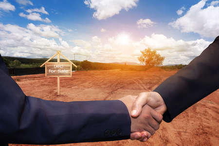 Empty dry cracked swamp reclamation soil, land plot for housing construction project with car tire print in rural area. Business concept.Business handshake land purchase