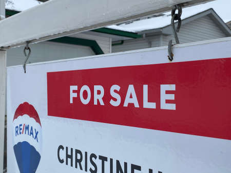 Calgary, AB, Canada. May 30, 2022. A close up to a REMAX Real Estate Yard Sign with the text For sale