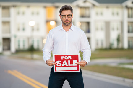 Real estate agent hold american house sale sign. Real estate sale or property investment concept. Buying new home. Handsome real estate agent in suit showing the house for sale.