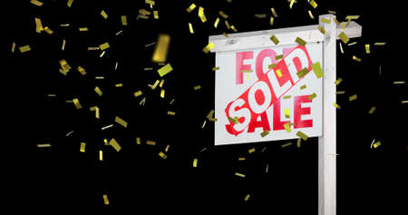Image of sold text on house for sale sign with gold confetti falling on black background. success, profit, finance and property business concept digitally generated image.