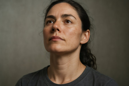 Portrait of a confident mature woman gazing upwards with a determined expression, conveying strength, resilience, and hope for the future