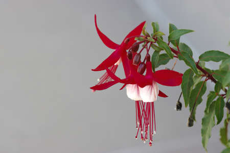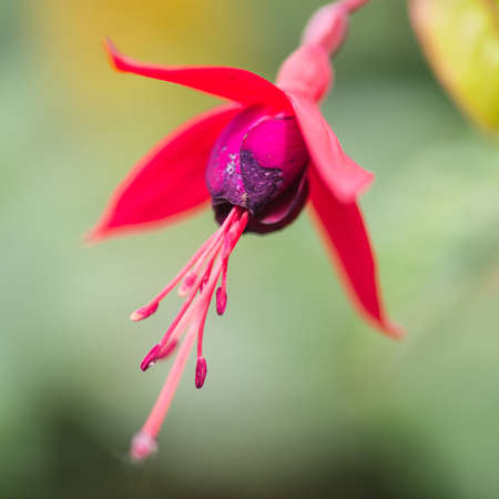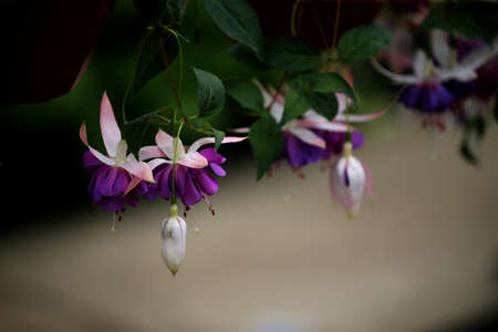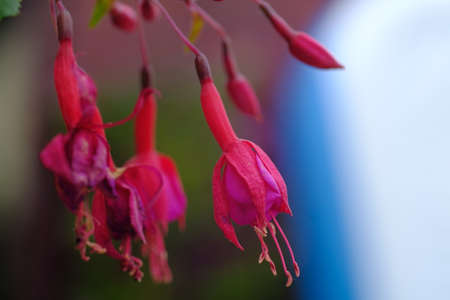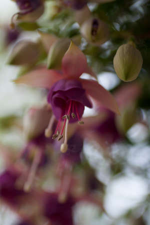 Close up of beautiful Fuchsia flowers with purple petals and red base