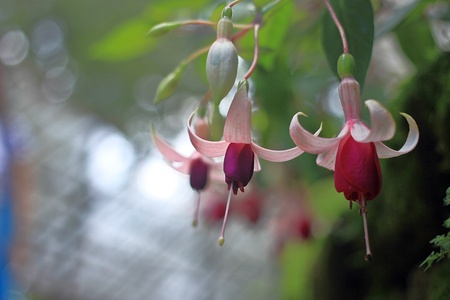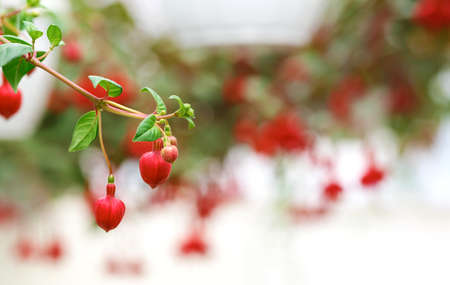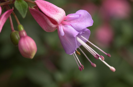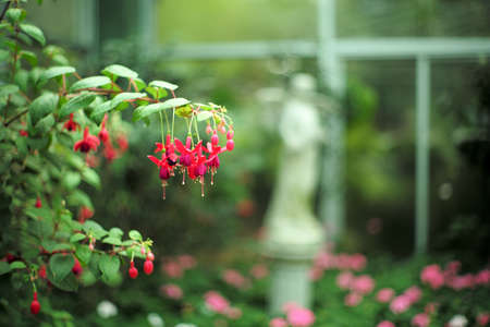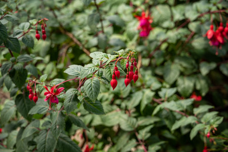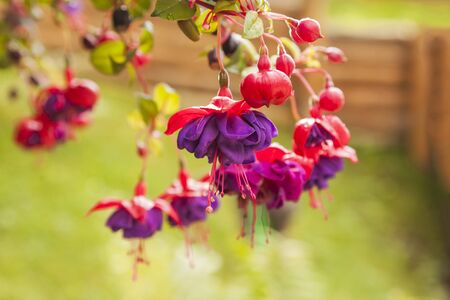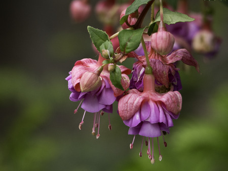 Fuchsia flowers in the garden, selective focus, shallow DOF.