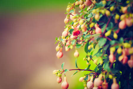 Bush group of small pink fuchsia flowers with green leaves, selective focus, shallow depth of field, toned with filters, copy space for text, green red background