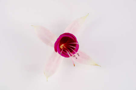blooming beautiful twig of purple and white fuchsia flower is isolated on white background, `Holly`s Beauty`, closeup