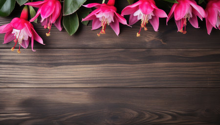 Fuchsia flowers on wooden background. Top view with copy space