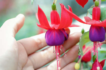 Close up of beautiful Fuchsia flowers on hand with purple petals and red base