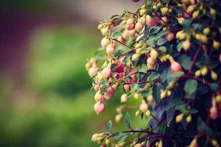Bush group of small pink fuchsia flowers with green leaves, selective focus, shallow depth of field, toned with filters, copy space for text, green background