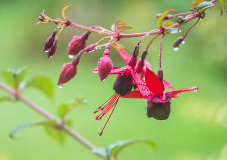 Pink Fuchsia flowers growing on bush in ornamental garden. Fuchsia magellanica hanging on tree branch in rain drops