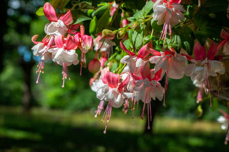 Close up view of beautiful blooming pink and white fuchsiaflower blossoms, cascading from a hanging basket on a sunny day