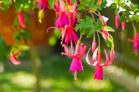 Beautiful fuchsia flowers hanging from the pot. Shallow DOF
