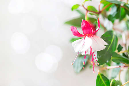 Beautiful flowering fuchsia plant. Pink and purple flowers on a bright background. Floral background. Selective focus