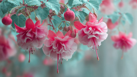 A captivating close-up reveals the intricate beauty of pink-purple fuchsia flowers. The delicate petals showcase vibrant hues, with soft textures and exquisite detail. This botanical image highlights the natural elegance of a garden favorite, perfect for themes of nature, beauty, and growth
