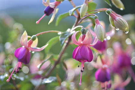 Elegant pink fuchsia flowers with rain drops, soft background close-up
